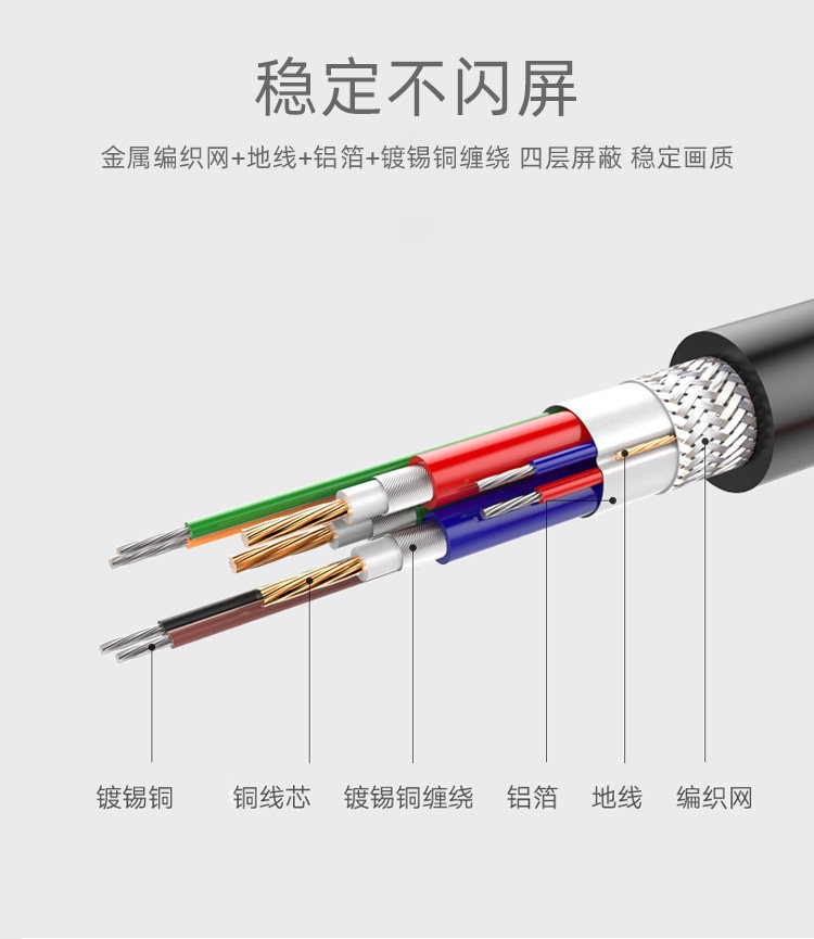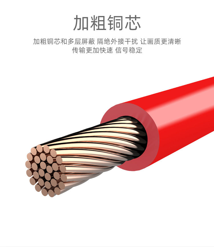 加粗铜芯和多层屏蔽 隔绝外接千扰 让画质更清晰传输更加快速 信号稳定