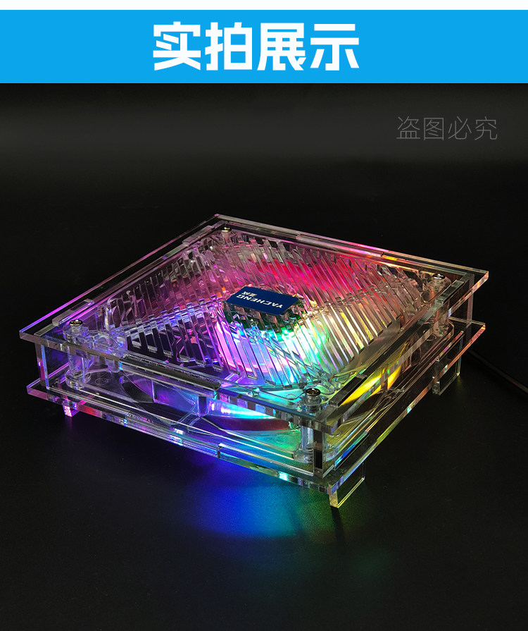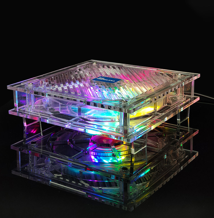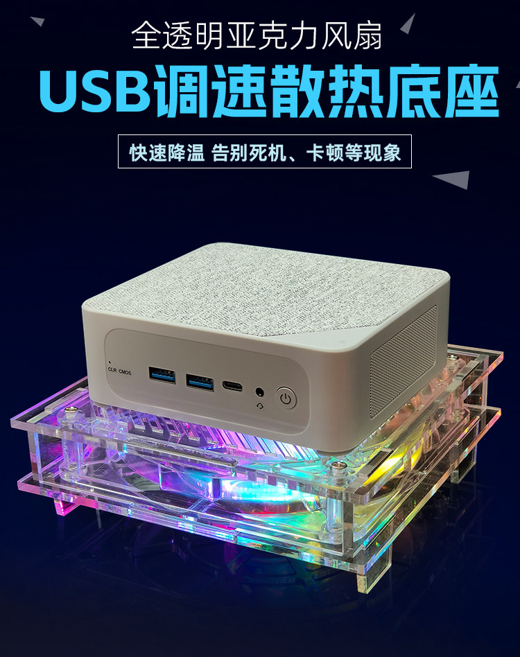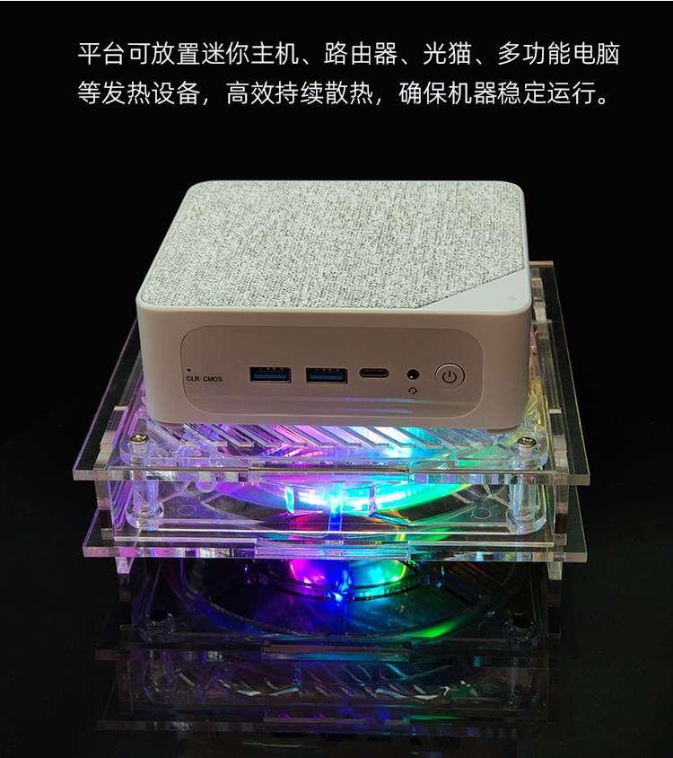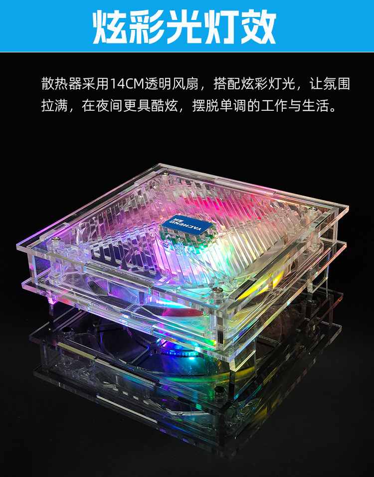 透明环保材质 全透明亚克力+全透明风扇、时尚美观,我们采用铜芯滚珠轴承,比普通风扇更加的耐用! 炫彩光灯效 散热器采用14CM透明风扇,搭配炫彩灯光,让氛围拉满,在夜间更具酷炫,摆脱单调的工作与生活。 平台可放置迷你主机、路由器、光猫、多功能电脑等发热设备,高效持续散热,确保机器稳定运行。